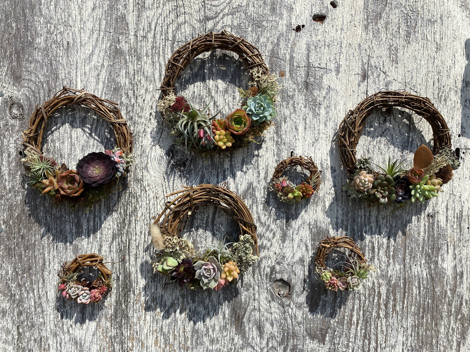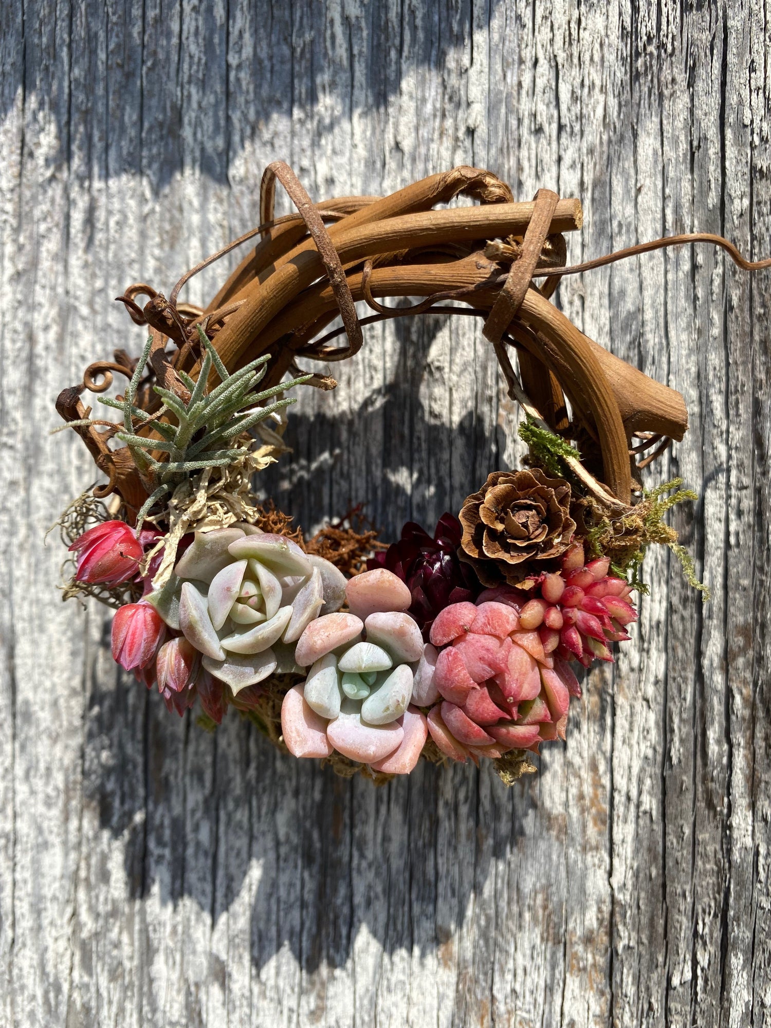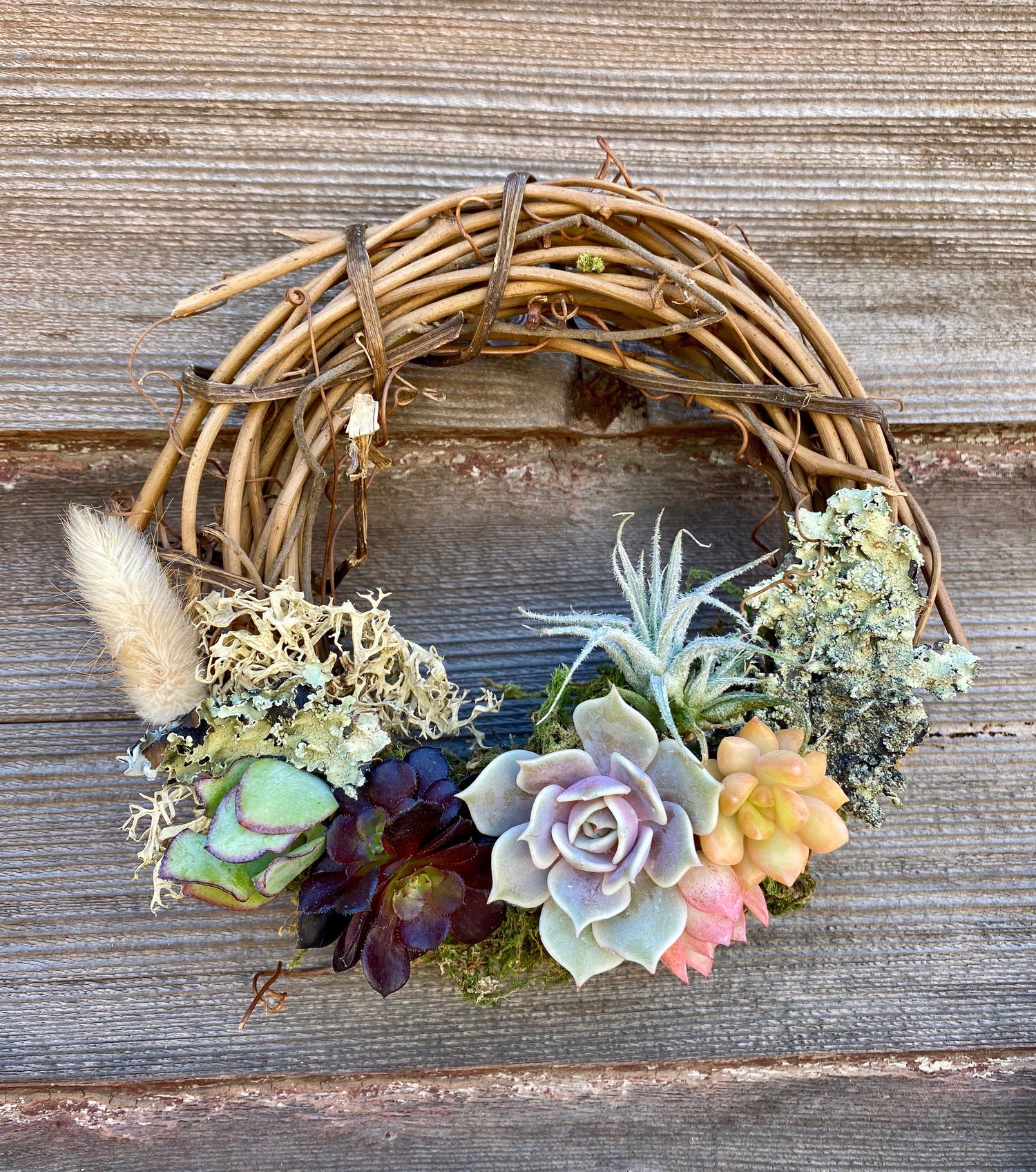 Celebrate the beginning of Autumn with our Fall Grapevine Wreaths. Each wreath is adorned with succulents, Tillandsia, and dried botanicals including lichen and preserved mosses. Wreaths are long-lasting and can be displayed indoors or outdoors with protection from the weather. Hand-crafted by our expert designers at Succulent Gardens. A great gift for the dinner party hostess, coworkers, and teachers. Repurpose succulents months later by planting the cuttings in the garden.