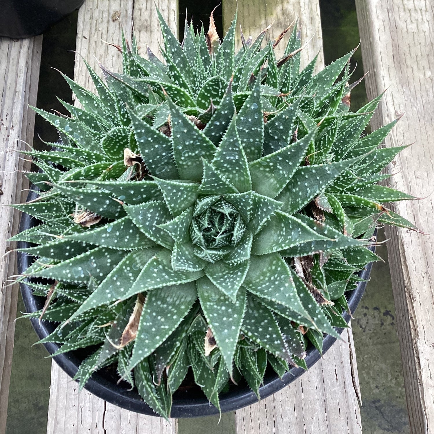 This solitary grower has small leaves that are slightly elevated with white spots and short hairs at their tips. This particular aloe prefers dappled shade, but can survive deeper shade.